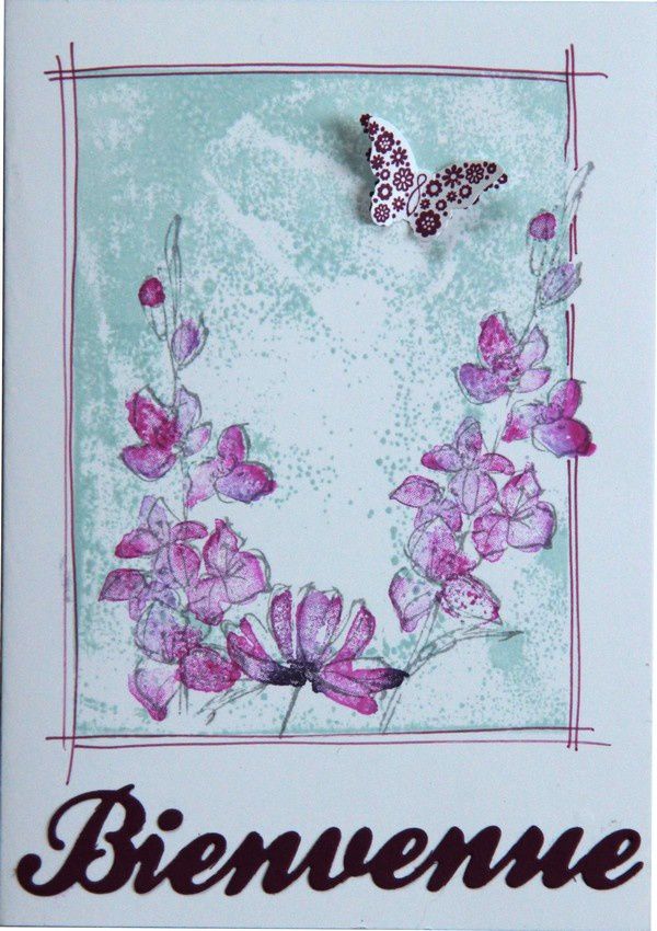 Ensuite, j'ai utilisé un lot de tampon qui se superpose pour avoir un motif avec plusieurs couleurs. Pour augmenter le résultat, j'ai utiliser la technique de la lingette bébé et des encres liquides pour avoir des fleurs multicouleurs.