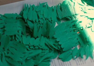 - Pour finir prendre du crépon vert, découper dans un rectangle des franges en biseau (cf la photo)