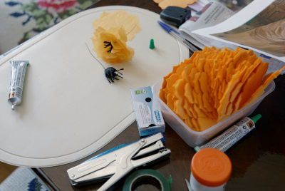 - Dans un rectangle de papier crépon noir couper des franges et les tortillonner, ensuite coller sur la base de la boule.