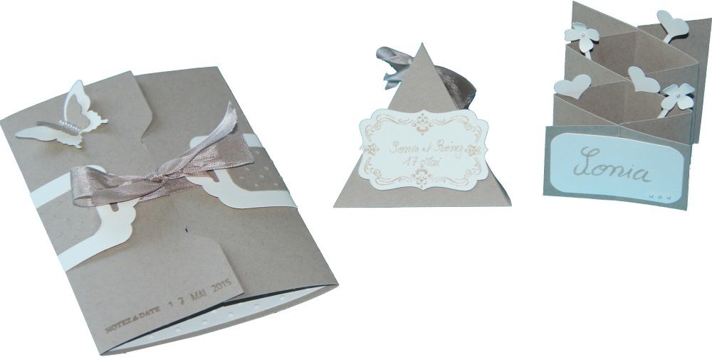 Le premier dans les naturel avec du papier brune dune et très vanille avec un faire part, une boite en triangle pour les dragées et le porte nom: