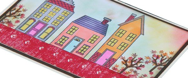 Les maisons ont été colorisées avec les nouveaux feutres à alcool et le fond a été travaillé avec les doigts mousse.