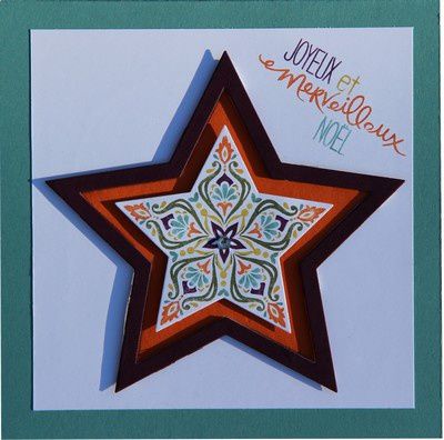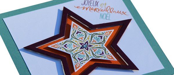 Voici une carte où j'ai repris la technique de colorisation avec des feutres sur les tampons, où je me suis amusée avec les découpes big shot étoiles et la mousse 3d!