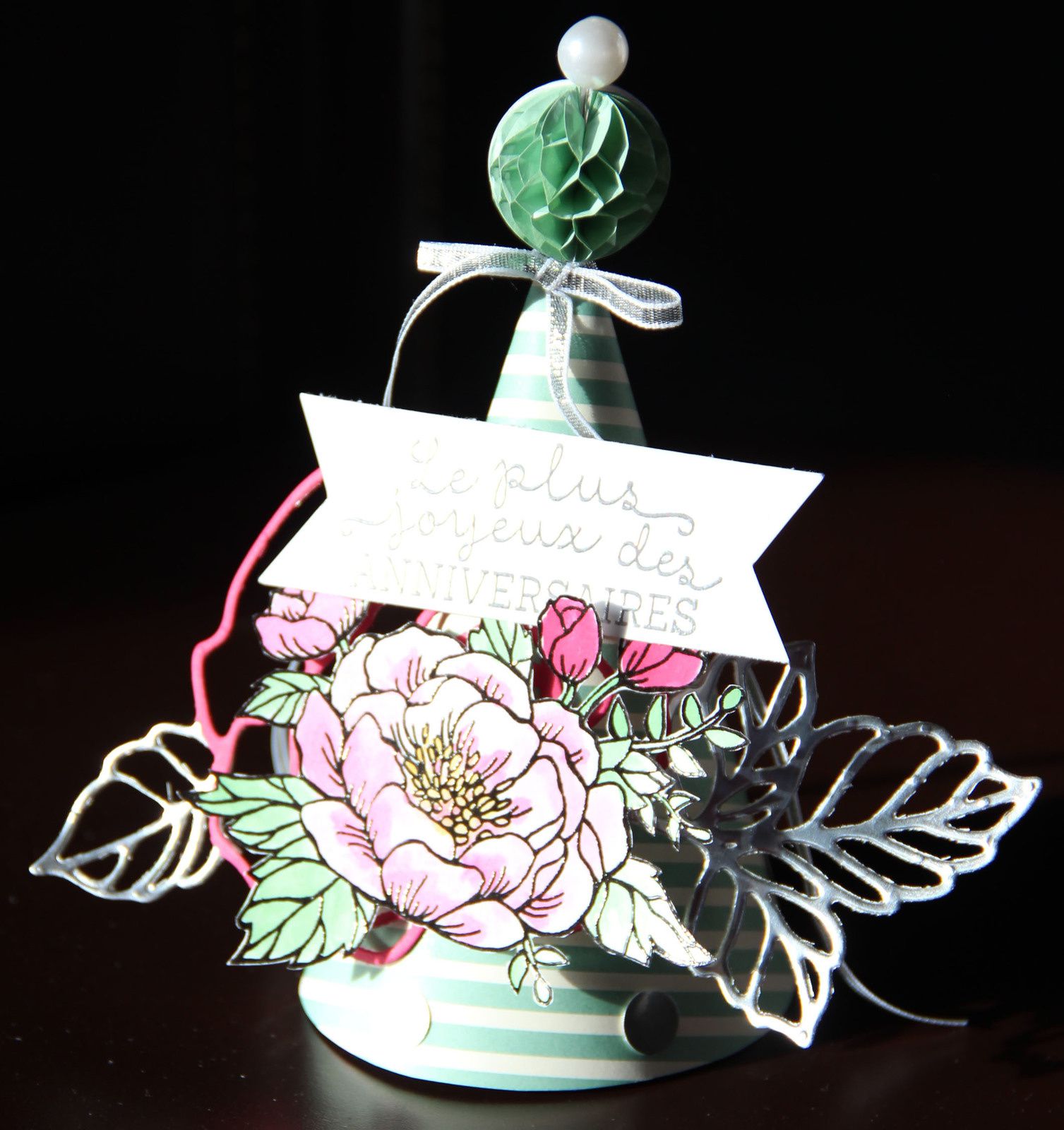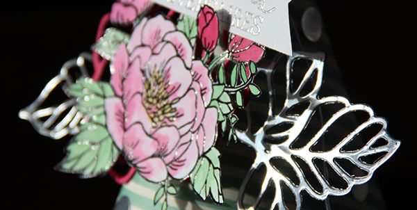 La fleur du set « fleurs d’anniversaire » (réf 141048) a été embossé avec un poudre noire puis colorisé avec les encres liquides.