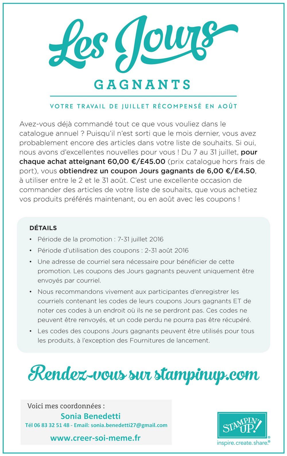 Les coupons des Jours gagnants seront envoyés par courriel, une adresse de courriel est donc nécessaire pour bénéficier de cette promotion. Stampin’Up! ne pourra pas renvoyer les codes de coupons, assurez-vous donc d’enregistrer le courriel et d’écrire les codes dans un endroit sûr, afin de ne pas perdre les coupons remportés.
