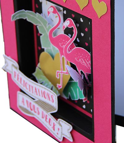 J’ai utilisé le papier imprimé assorti « spécialité  touche de rose » (réf 141648) dont deux feuilles ont des motifs dorés que vous pouvez voir sur la bande blanche verticale.