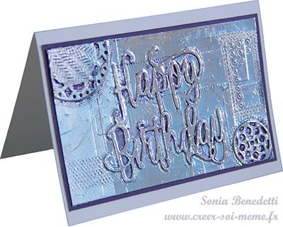 Pour mettre en valeur cette technique, j'ai une carte réalisée avec la nouvelle découpe "Happy Bristhday" sur le principe de l'effet faux métal.