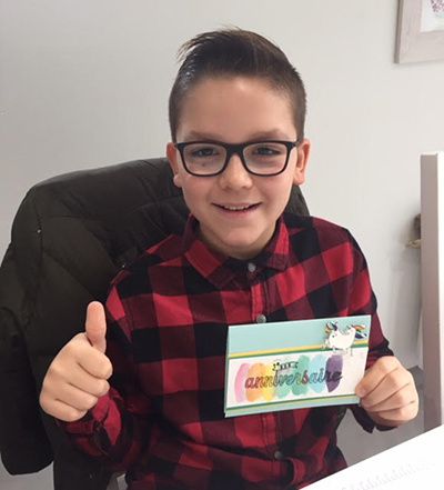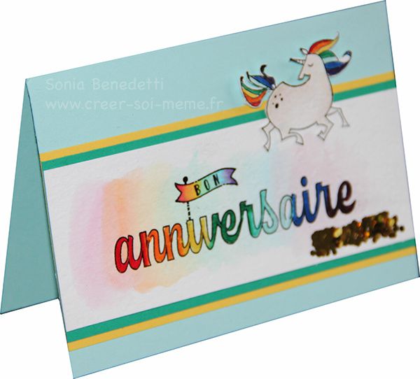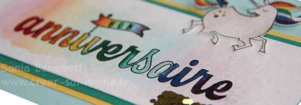 Le tampon anniversaire avait été embossé sur du papier aquarelle avant la colorisation avec l’aqua’painter.