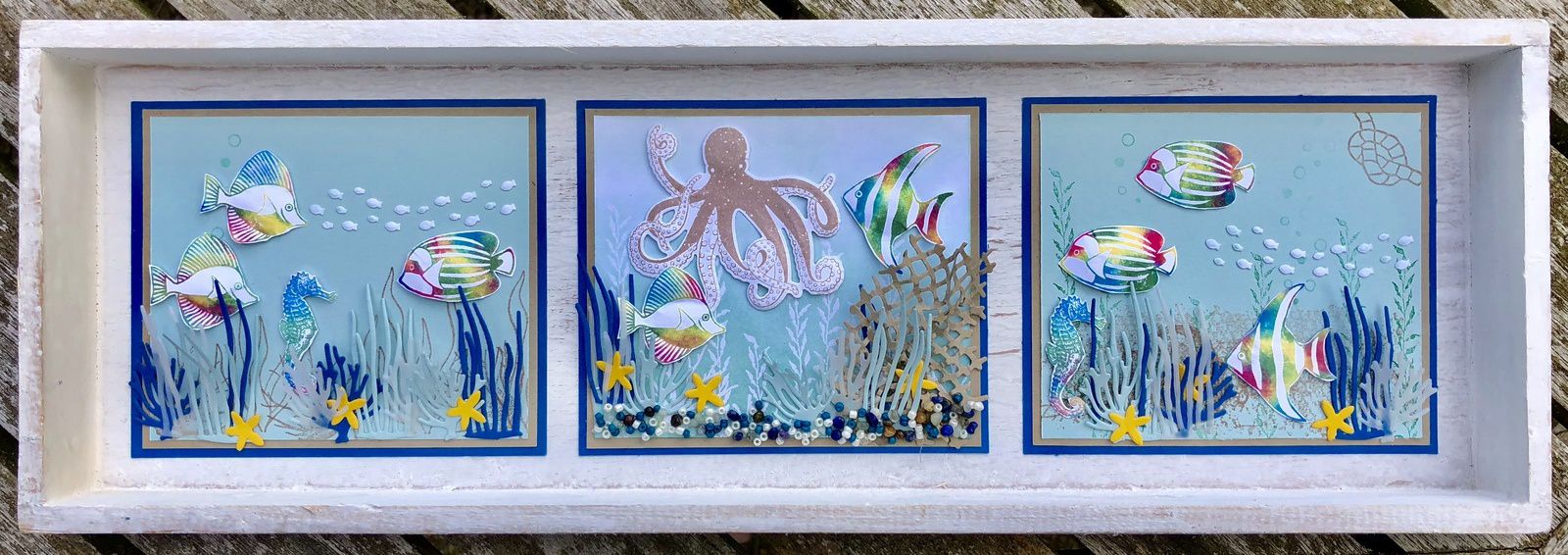 Comme l’exposition est sur le thème de Deauville, ses planches, sa plage, je me suis imaginée un mer avec une eau turquoise, des poissons tropicaux….