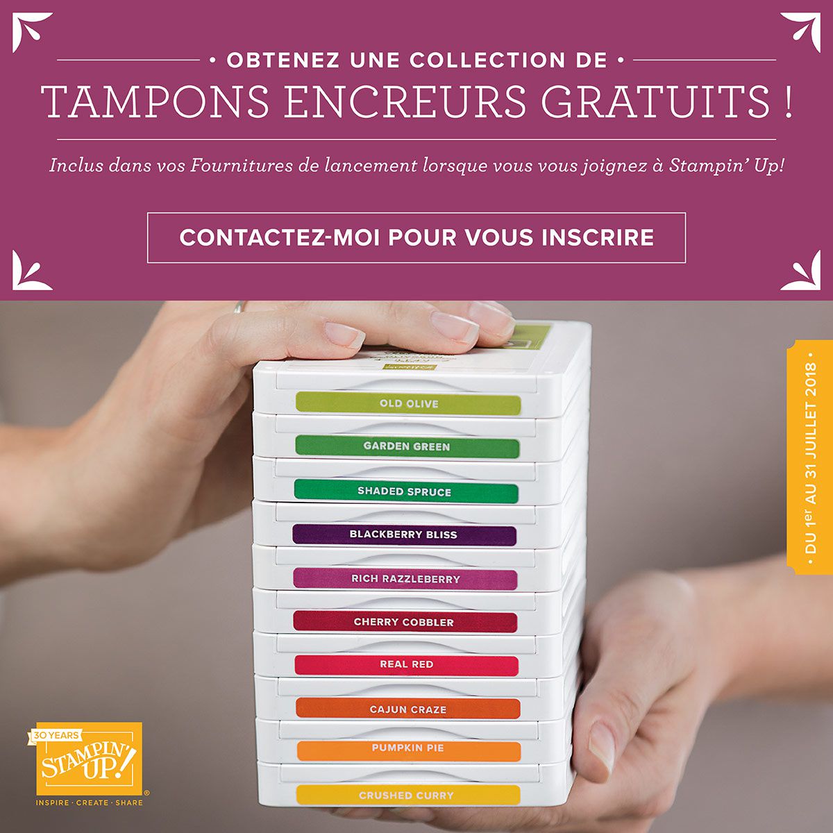 En Juillet 2018, Stampin'Up! offre une collection de 10 tampons encreurs de votre choix dans votre lot de fournitures de lancement si vous rejoignez mon équipe de démonstratrices.
