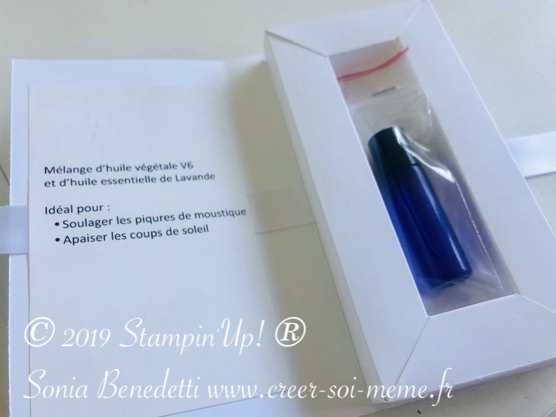 C'est une carte avec à l'intérieur un cadre qui renforce un flacon dans lequel j'ai mis un mélange d'huile essentielle de lavande et d'huile végétale V6 pour apaiser les piqures de moustique ou les coups de soleil.
