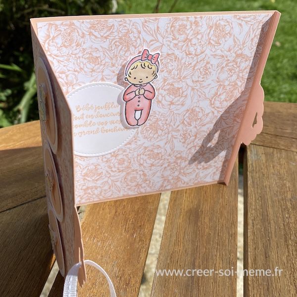 Une de mes filleules et amie vient d'avoir une adorable petite fille et pour l'occasion, j'ai réalisé une carte au format 15×15 avec le papier pivoine et des anciens sets Stampin'Up!.