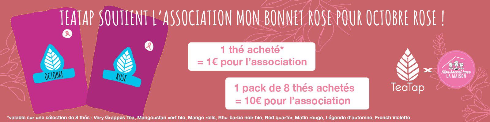 - Pour chaque ensemble contenant les 8 thés sélectionnés, 10€ seront reversés.