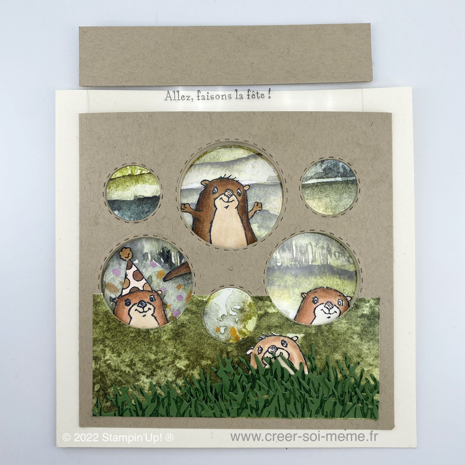 J'avais envie de donner du mouvement à cette carte avec une astuce simple de tag en papier fenêtré pour faire bouger les petits loutres…