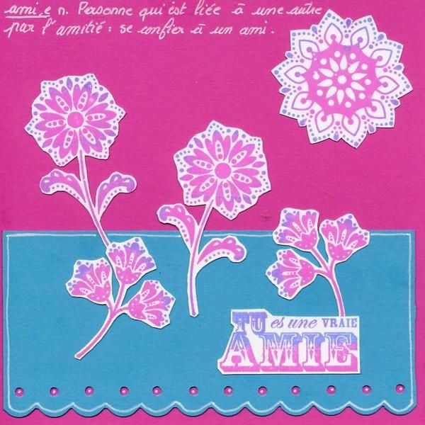 coloré les tampons avec deux couleurs d’encres pour donner de l’effet au fleurs que j’avais détouré…..