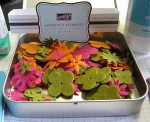 – Accente & Elements « Fusion fleurie » (réf 113662 p 79 à 16.50€) – 130 fleurs en feutrine livrées dans une boîte métallique – 14 motifs de fleurs en 3 couleurs.