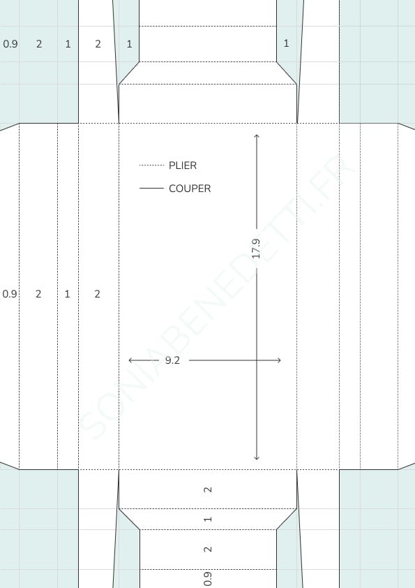 – Sur la longueur de 21,4cm, venir marquer les plis à 2cm – 9,2cm – 11,7cm et 18,9cm