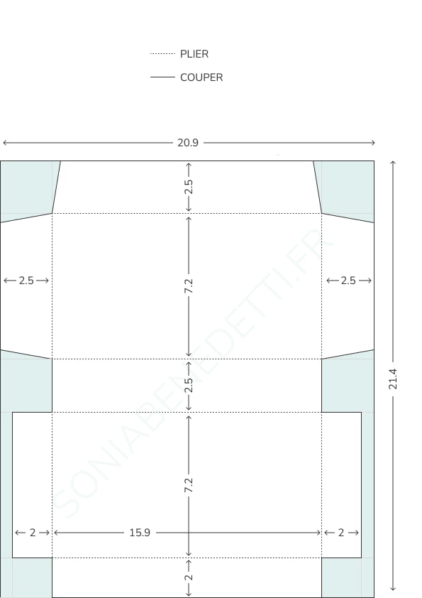 Sur la largeur de 20,9cm venir marquer les plis à 2,5cm et 18,4cm