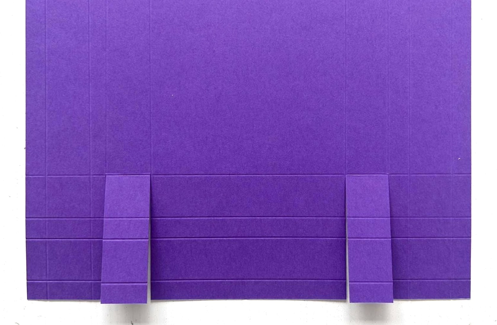 Sur le bord de 21cm (largeur) faire une coupe de 1,9cm de longueur (jusqu’au 2e pli) à 6,9cm et à 14,1cm