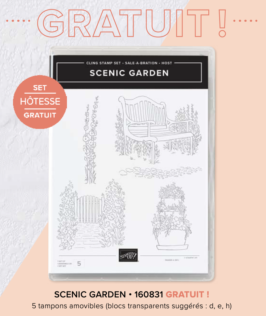 - Que vous vouliez organiser un atelier : en tant qu’hôtesse un set de tampon exclusif » Scenic Garden »