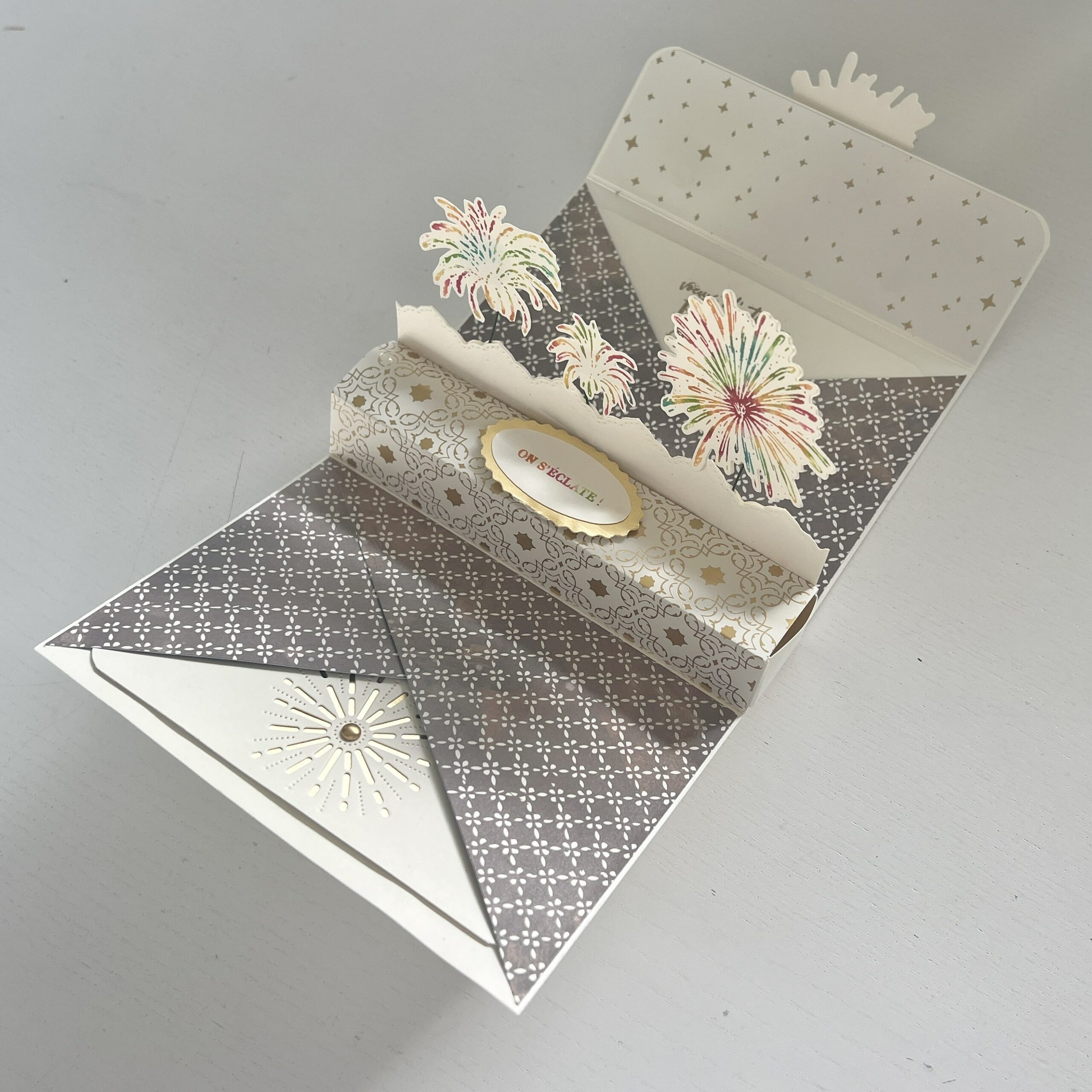 – 2x papier 15×10,7 cm (Pochette) 👉🏻 Couper en 4 triangles, respecter le sens.